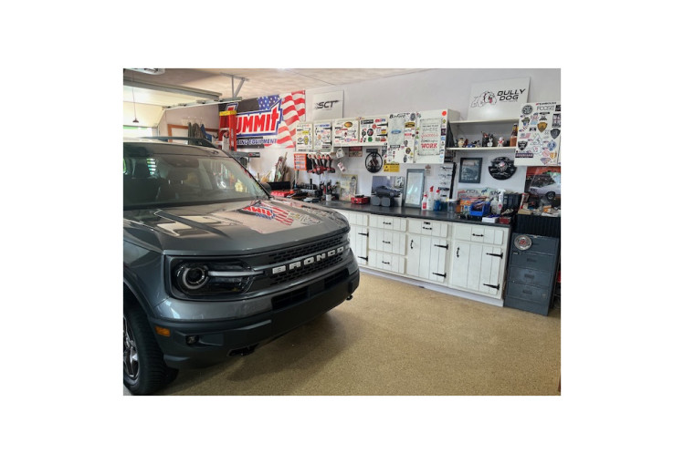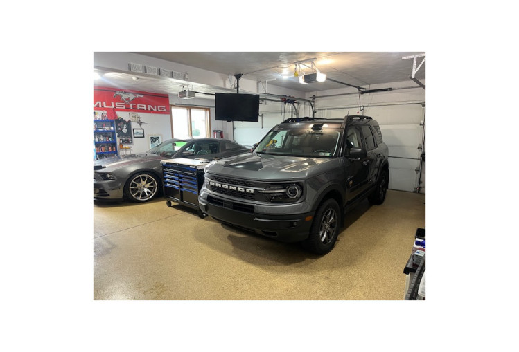 Additional highlights include a heated, oversized 2-car garage (approx. 600 sq ft) with epoxy-coated floors, center floor drains in each bay, upper and lower cabinets, work surface, and a TV on an overhead swivel mount.