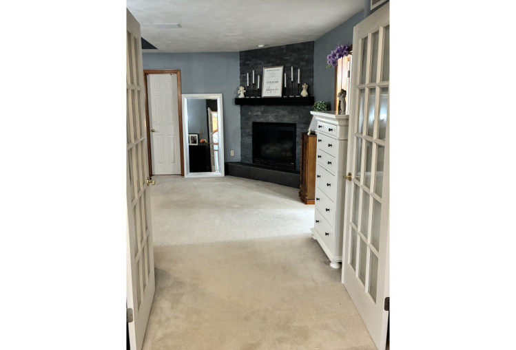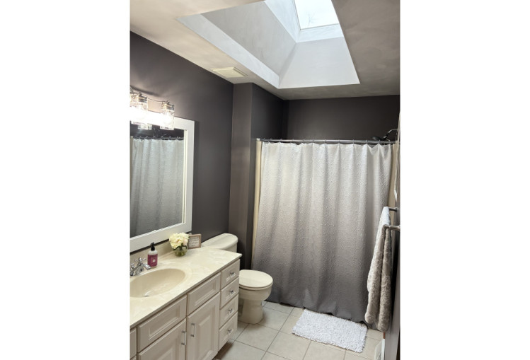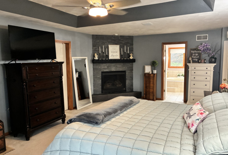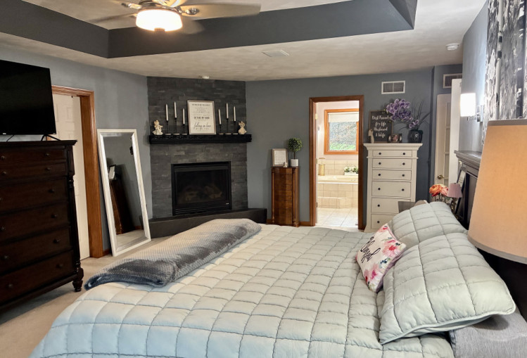 Upstairs, the luxurious master bedroom is a true sanctuary with its own gas fireplace featuring a floor-to-ceiling stone surround, a tray ceiling, and a generous walk-in closet (approx. 65 sq ft) with additional attic storage. The en-suite master bath includes a relaxing jetted tub and a skylight. A second bath with its own skylight provides convenience for guests.