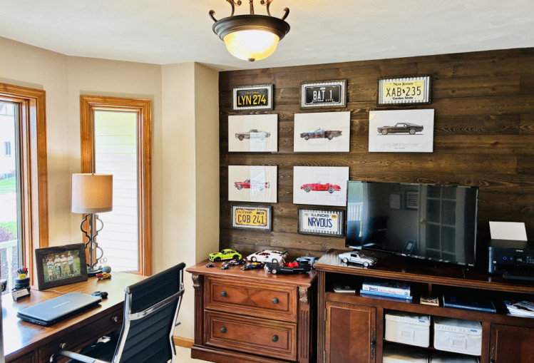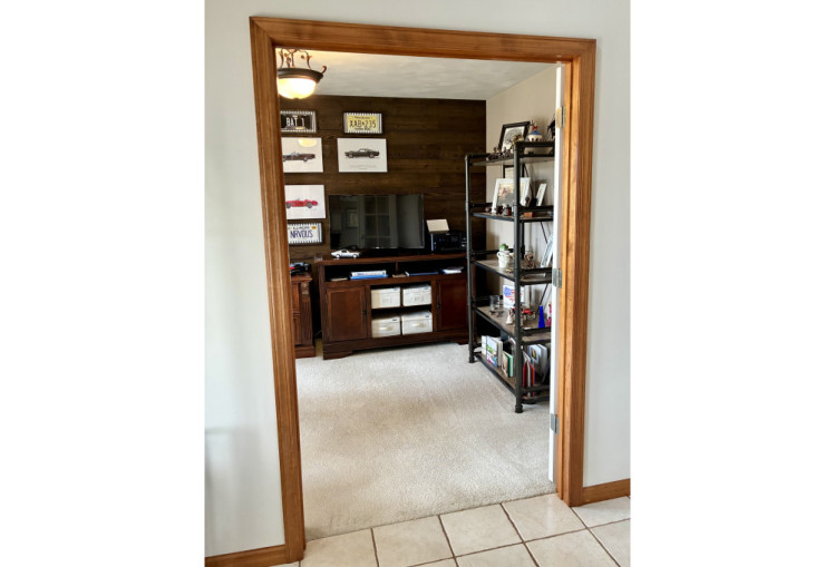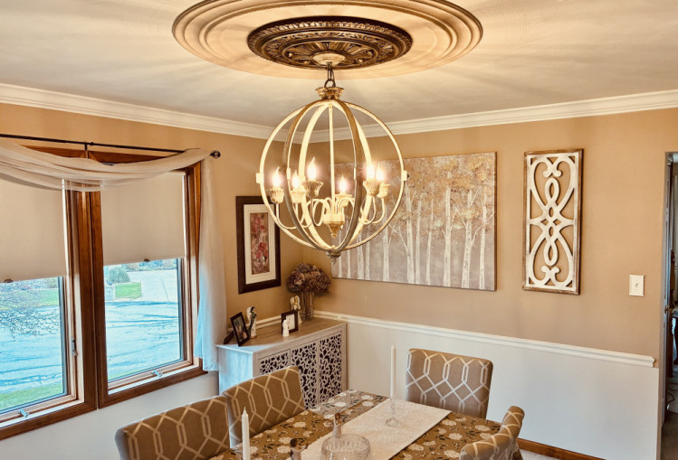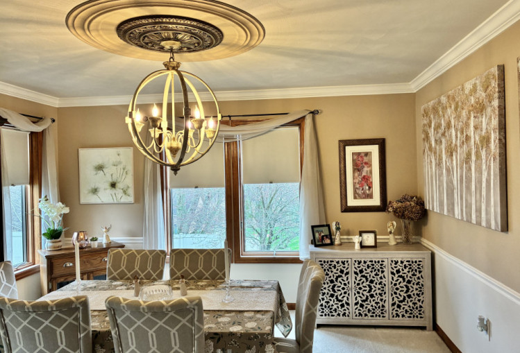 The heart of the home is the updated kitchen boasting elegant granite countertops, a glass-tile backsplash, a newer microwave, and a newer KitchenAid refrigerator. It flows seamlessly into the formal dining room accented with crown molding and chair rail. A cozy den with a striking all-wood accent wall offers a quiet retreat or flexible workspace.