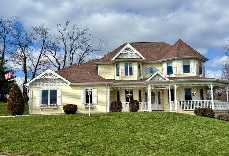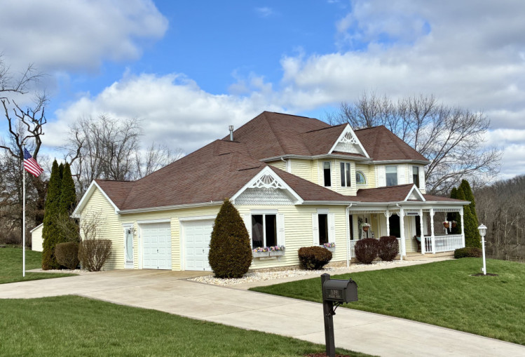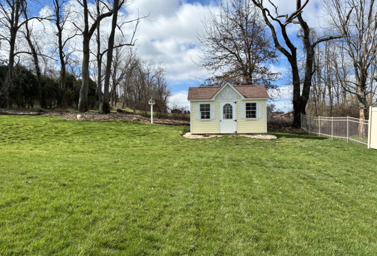 Outside, enjoy year-round outdoor living on the concrete wraparound covered porch with its charming porch swing, plus a 200 sq ft covered concrete patio with awning in the backyard. A large matching storage shed and maintenance-free stone-covered flower beds complete the low-maintenance exterior.